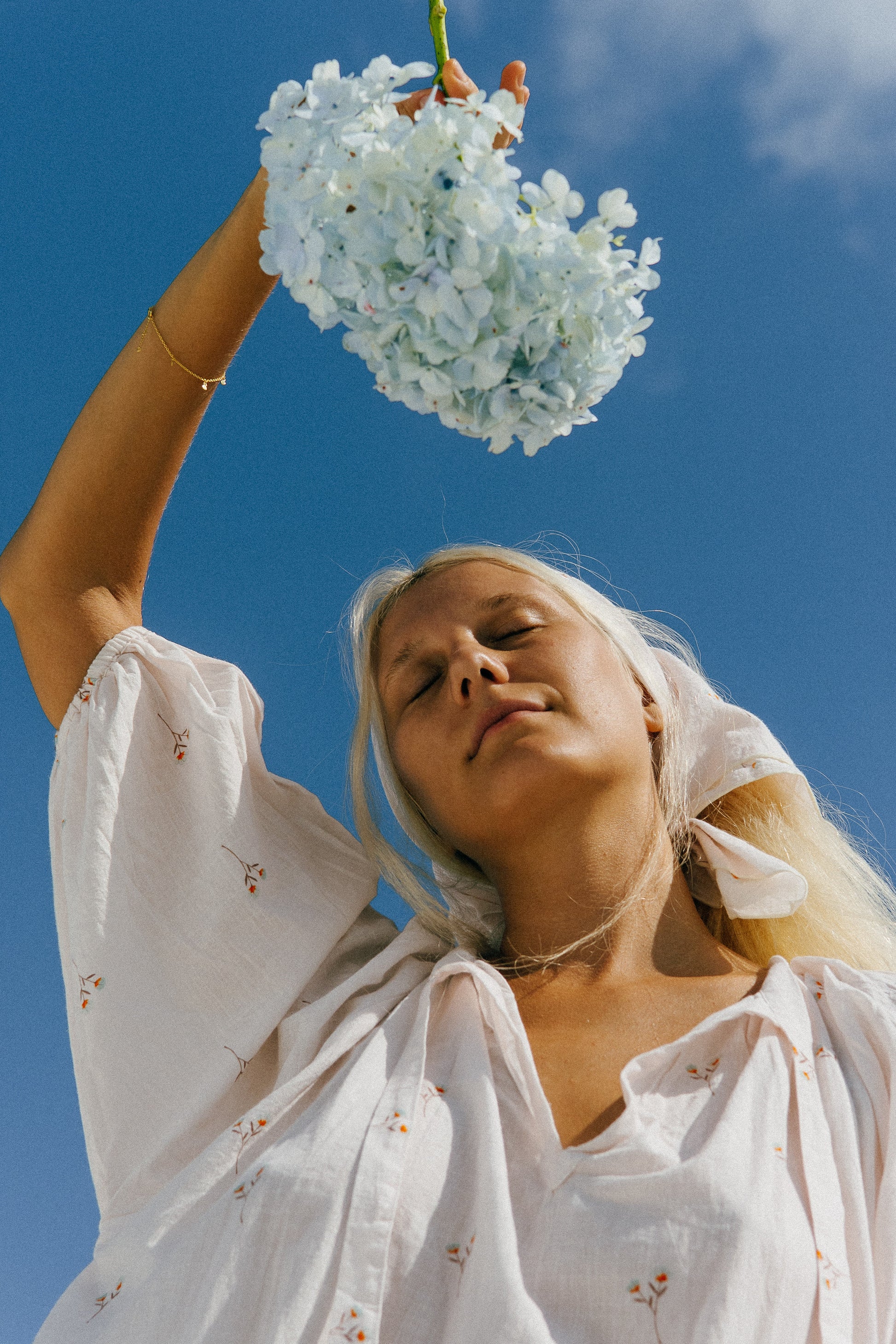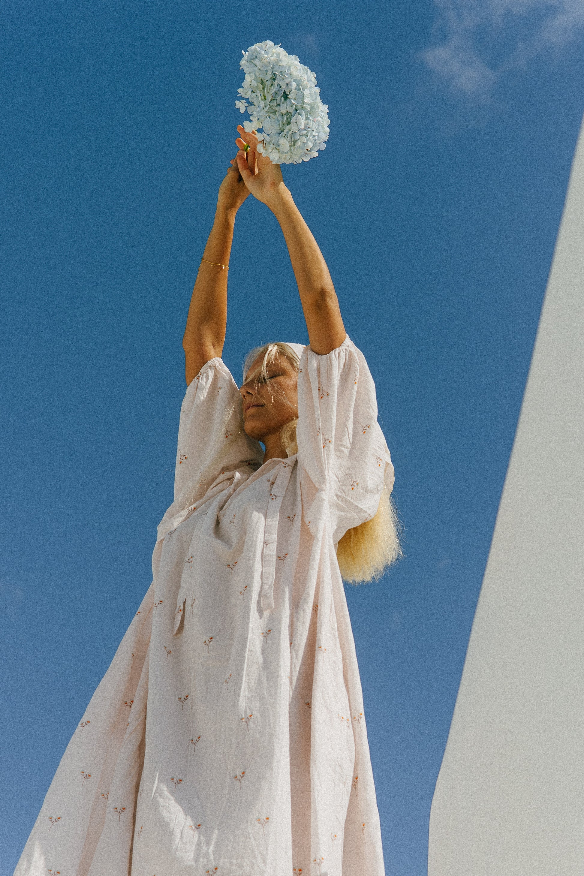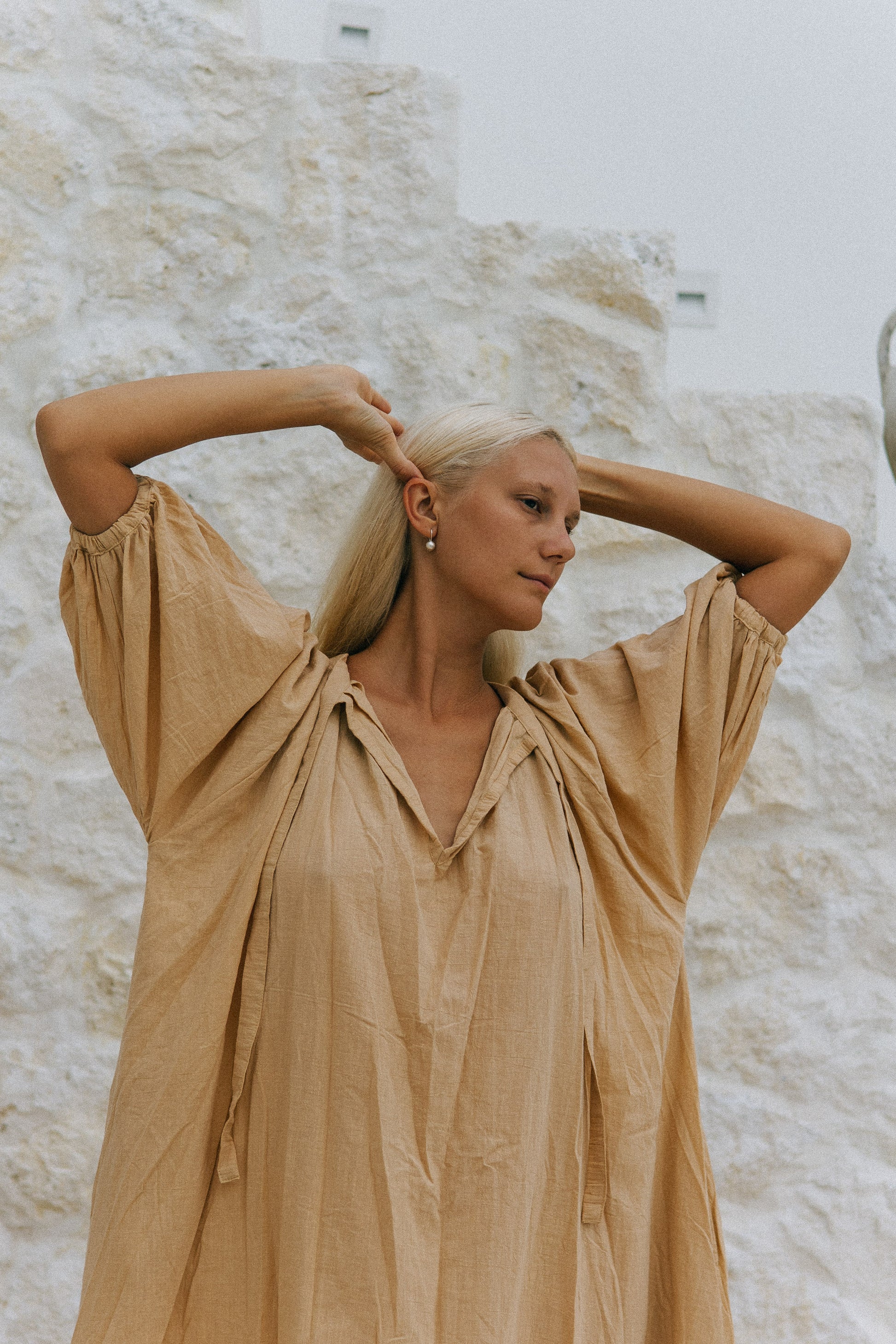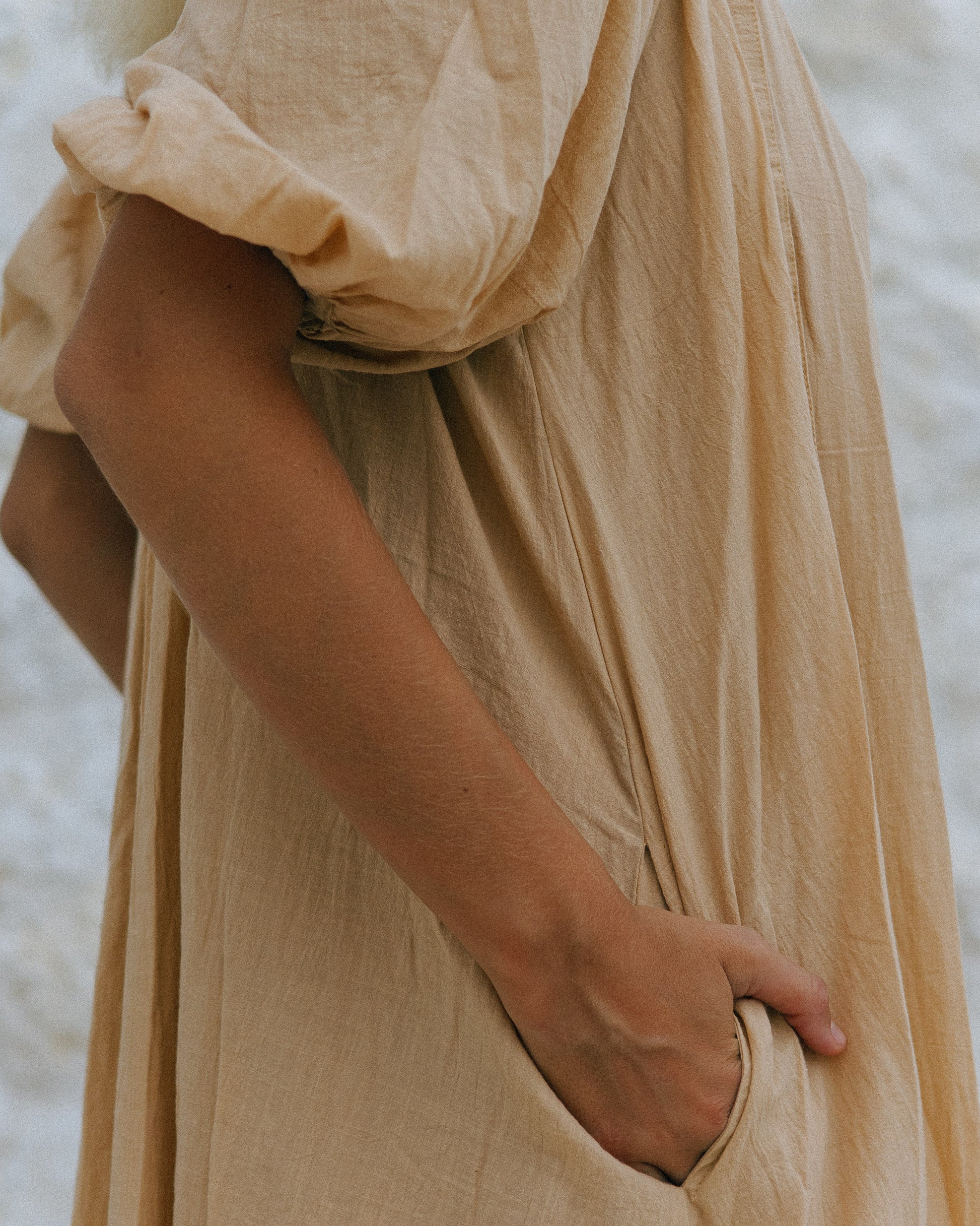 An elevated day dress in an easy mid length featuring a flowy drop and raglan sleeves, finished with elasticated cuffs. Available in lightweight cotton in our custom Vintage Floral Print and Sand.